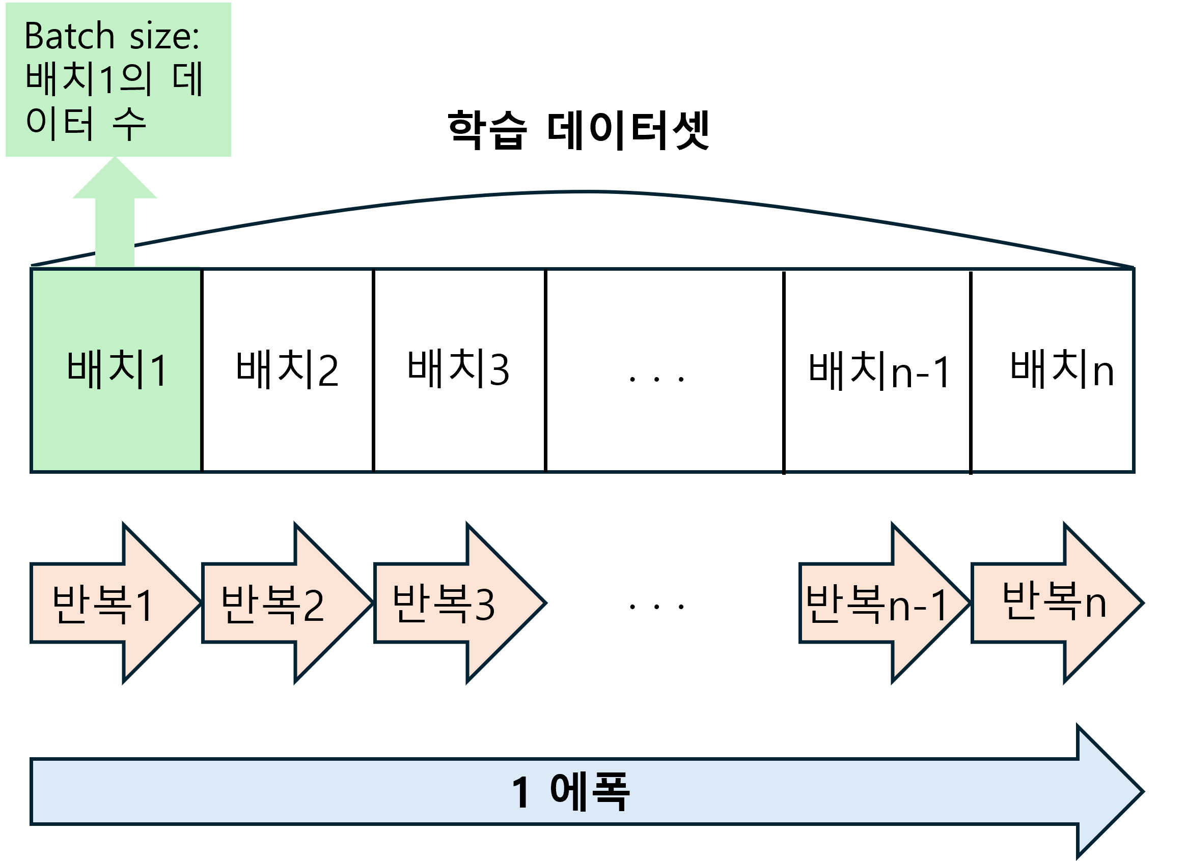 - epoch: 하나의 단위로, 모델이 학습 데이터셋 전체에 대한 학습을 완료한 상태