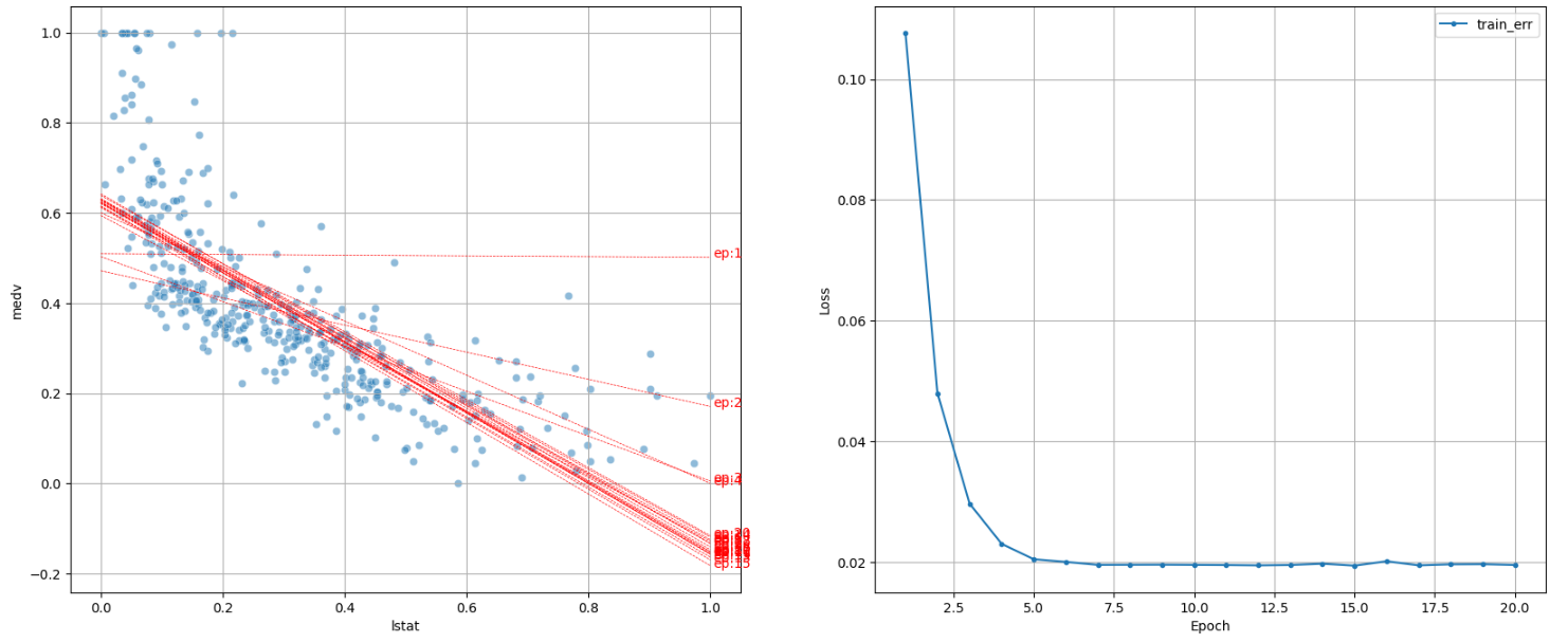 def dl_visualize(ep, lr): clear_session() model = Sequential([ Dense(1, input_shape=(1,)) ]) model.compile(loss='mse', optimizer=Adam(learning_rate=lr)) # 수정된 부분: .weights.h5로 파일 경로 확장자 변경 mcp = ModelCheckpoint(filepath='/content/epoch_{epoch:02d}.weights.h5', monitor='val_loss', save_best_only=False, save_weights_only=True) history = model.fit(x_train_s, y_train_s, verbose=0, epochs=ep, callbacks=[mcp]).history coef, intercept = [], [] for i in range(ep): file = f'/content/epoch_{i+1:02d}.weights.h5' model.load_weights(file) coef.append(np.array(model.weights[0])[0,0]) intercept.append(np.array(model.weights[1])[0]) plt.figure(figsize=(20, 8)) plt.subplot(1, 2, 1) sns.scatterplot(x=x_train_s.reshape(-1,), y=y_train_s, alpha=.5) plt.grid() plt.xlabel('lstat') for i in range(ep): x = np.linspace(0, 1, 10) y = coef[i] * x + intercept[i] plt.plot(x, y, 'r--', linewidth = .5) v = 1.005 plt.text(v, coef[i] * v + intercept[i], f'ep:{i+1}', color='r') plt.subplot(1, 2, 2) plt.plot(range(1, ep+1), history['loss'], label='train_err', marker='.') plt.ylabel('Loss') plt.xlabel('Epoch') plt.legend() plt.grid() plt.show()