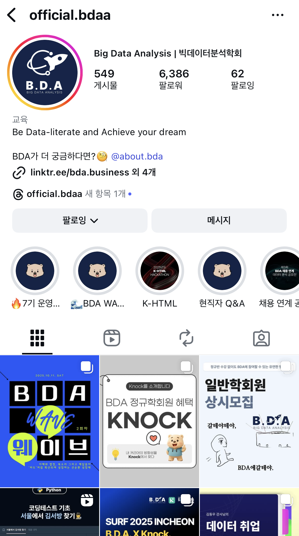 2주차 블로그 챌린지 BDA학회(빅데이터 분석 학회)에 관심있는 분들은 인스타(@official.bdaa)나 웹사이트(https://bdaprogram.oopy.io/) 들어가보세요!