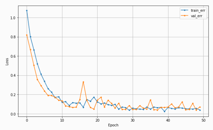 각 epoch마다 train error와 val error가 어떻게 줄어들고 있는지 확인하기 위한 곡선이다.