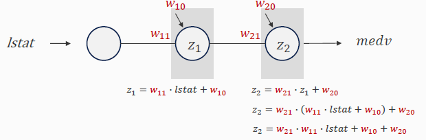 활성화 함수가 없다면 아래 도식처럼 z2는 w11의 영향력이 없어져 히든 레이어를 아무리 추가해도 선형 모델이 된다.