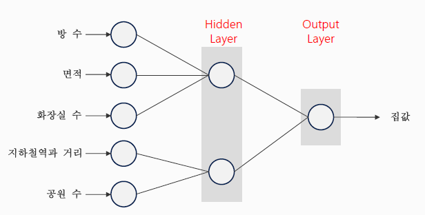 출처: BDA 딥러닝의 이해(1) 4주차 수업자료 학습 단계에서 예측 값과 실제 값을 비교하며 loss function으로 오차를 계산하고, 오차를 줄이기 위해 파라미터(가중치)를 업데이트 한다. 학습을 통해 오차를 최소화하는 파라미터(가중치)를 찾았고, 그 값으로 각각 요인에 가중치를 줘 최종 집값을 예측하게 된다.