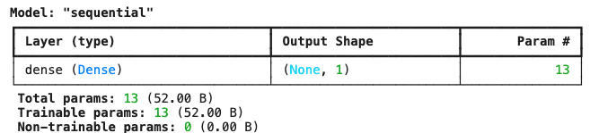 target = 'Sales' x = adv.drop(target, axis=1) y = adv.loc[:, target] x_train, x_val, y_train, y_val = train_test_split(x, y, test_size=.2, random_state = 20)# ---------------- # 딥러닝 모델링 # ---------------- from keras.models import Sequential # Sequential(순차 모델 컨테이너 Seq 클래스) from keras.layers import Dense, Input # Input: 입력 텐서의 형상(shape)을 선언/ Dense: 완전연결측(=선형 결합+활성함수) from keras.backend import clear_session # 노트북에서 여러 번 모델을 만들 때 이전 그래프/메모리 잔여물을 지워줍니다. # 1) 전처리: Scaling scaler = MinMaxScaler() x_train = scaler.fit_transform(x_train) x_val = scaler.transform(x_val) # 2) 모델 선언 x_train.shape nfeatures = x_train.shape[1] #num of columns # 입력 특성(열) 개수를 꺼내 정수로 저장. nfeatures clear_session() #메모리 정리 model = Sequential( [Input(shape =(nfeatures,)), # input으로 nfeatures(3)개를 받겠다 Dense(1)] ) # layer 수 = 1 model.summary() # 3) 컴파일 model. compile(optimizer='adam', loss='mse') # 4) 학습 model.fit(x_train, y_train) # 5) 예측 pred = model.predict(x_val) # 6) 검증 print(f'RMSE : {root_mean_squared_error(y_val, pred)}') print(f'MAE : {mean_absolute_error(y_val, pred)}') print(f'MAPE : {mean_absolute_percentage_error(y_val, pred)}')코드 중간에 model.summary()를 실행하면 아래와 같이 모델 구조와 파라미터 정보를 출력할 수 있다.